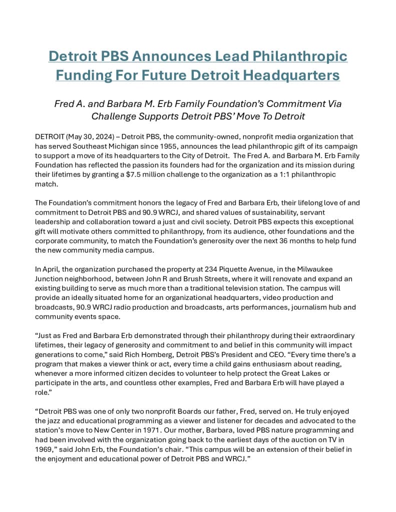 Detroit PBS is honored and thankful to announce the lead philanthropic gift of its campaign to support a move of its headquarters to the City of Detroit. The Fred A. and Barbara M. Erb Family Foundation has reflected the passion its founders had for the organization and its mission during their lifetimes by granting a $7.5 million challenge to the organization as a 1:1 philanthropic match.